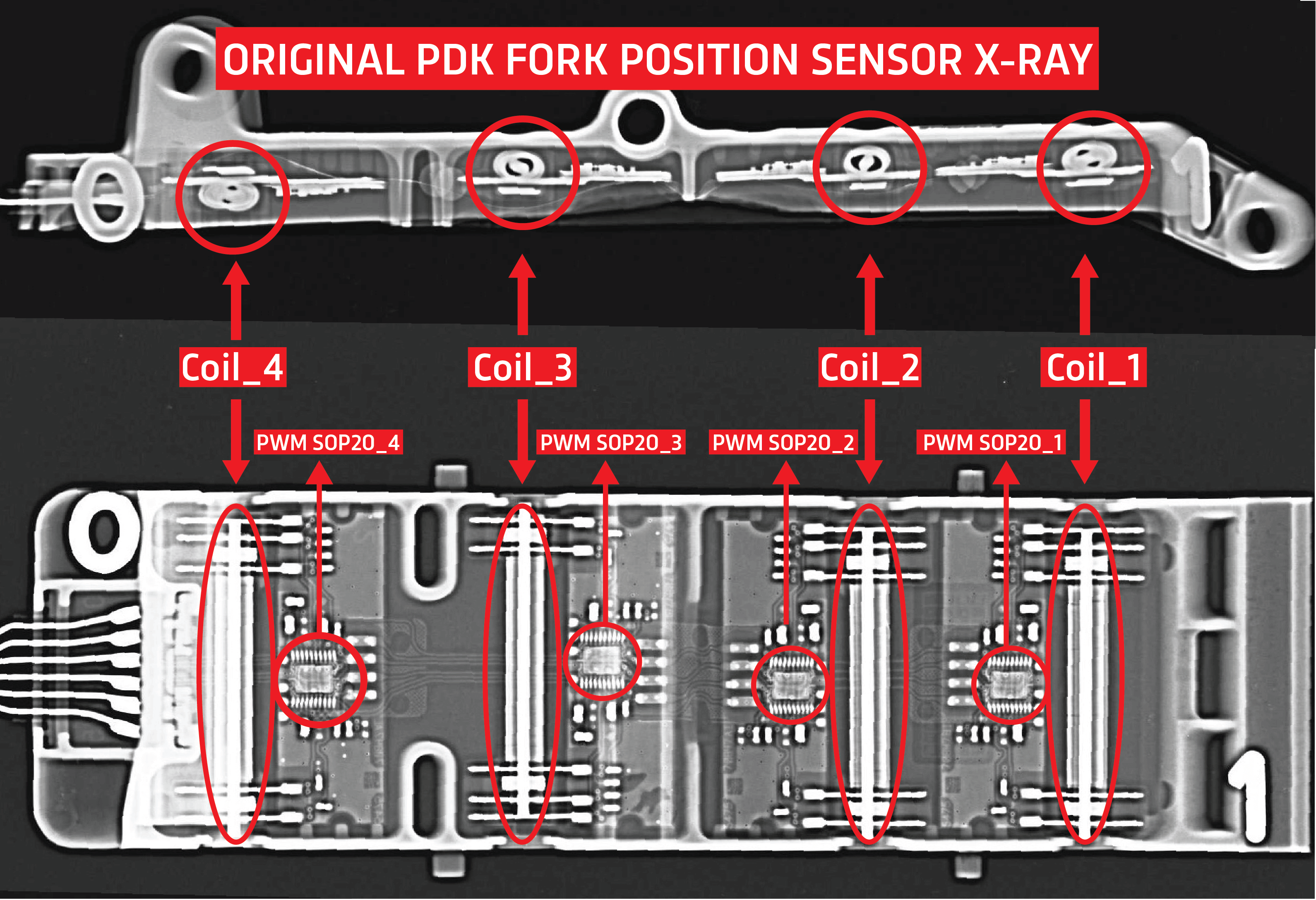 Pictured below is the X-Ray of the original Fork Position Sensor still used in current PDK Transmission production. This complex design utilizes Hall-Effect PWM Sensors and sensing coils